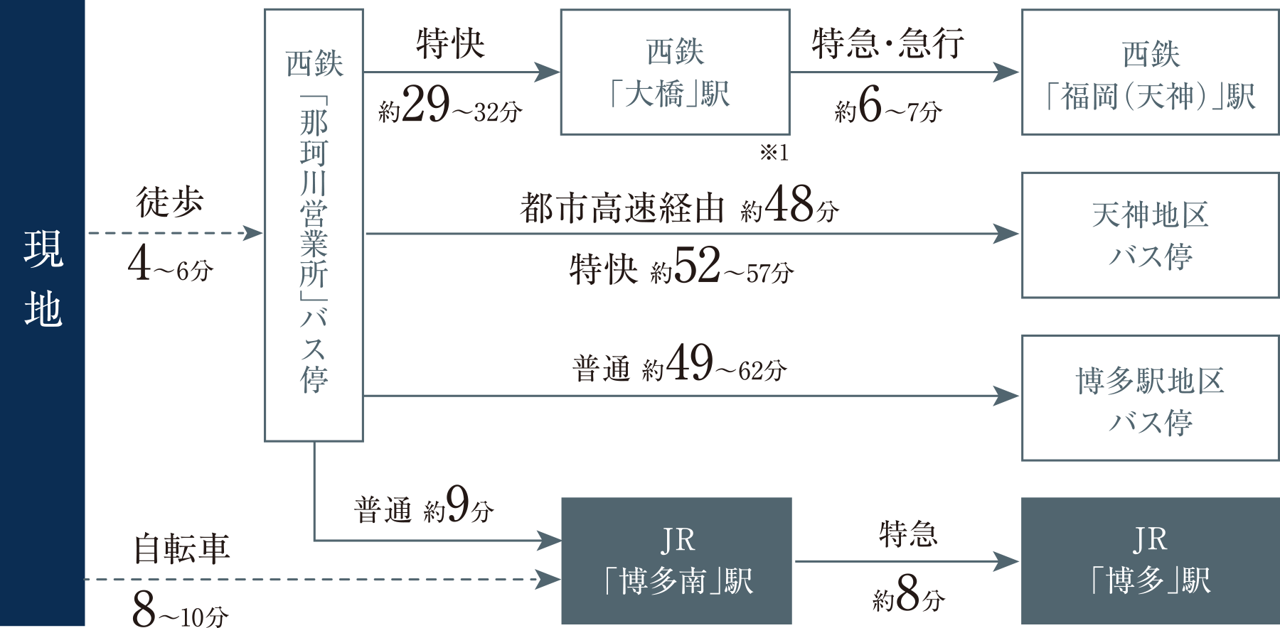 ※現地からの各施設への所要時間は、地図上での概測距離を基に算出したものです。(徒歩分数は80m=1分、自転車は時速15km、車は時速40kmで算出し、端数は切り上げています。)※販売状況の変動により各施設への所要時間が若干前後する場合もございます。※当タウン内における住所で中学校校区が分かれます。(恵子3丁目:那珂川北中学校/道善5丁目:那珂川中学校)※通学区は地方公共団体の指導により変更になる場合があります。※交通所要時間は平日通勤ラッシュ時のもので、曜日・時間帯により多少所要時間は異なります。※乗換え・待ち時間は施設状況や時間帯により異なります。※令和7年5月21日現在