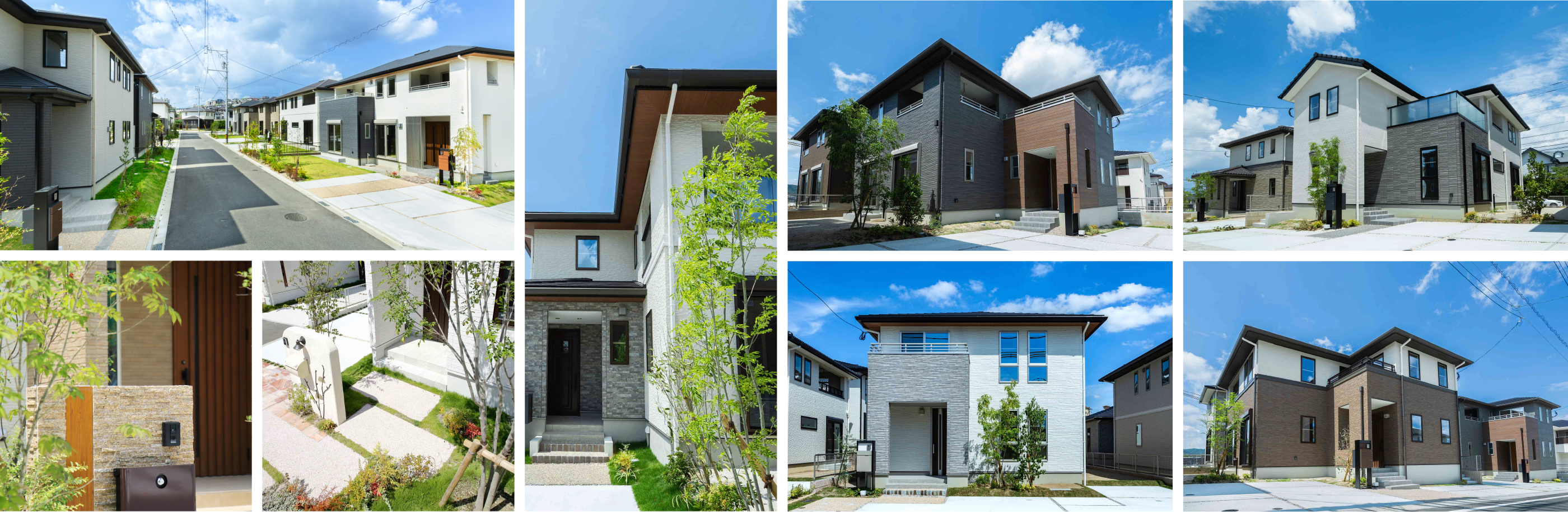 ※掲載の街並み完成予想図は、現地付近空撮(2025年5月撮影)に図面を基に描いたイラストパース(想定含む)を合成したイメージで、外構・植栽・色などは実際とは異なります。行政官庁の指導、施工上の都合および改良のため設計・仕様・外構工事等に変更が生じる場合があります。また、現地周辺の建物等を省略して描いております。