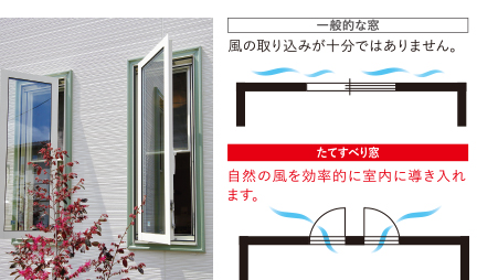 窓形状で効果的に通風と採光をコントロール。さらに、開口部の位置や数、形状などに工夫を加え、有効に風を取り込みます。