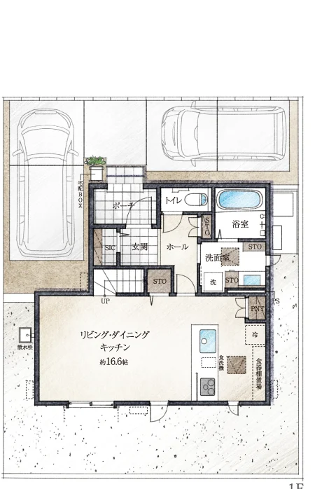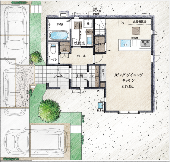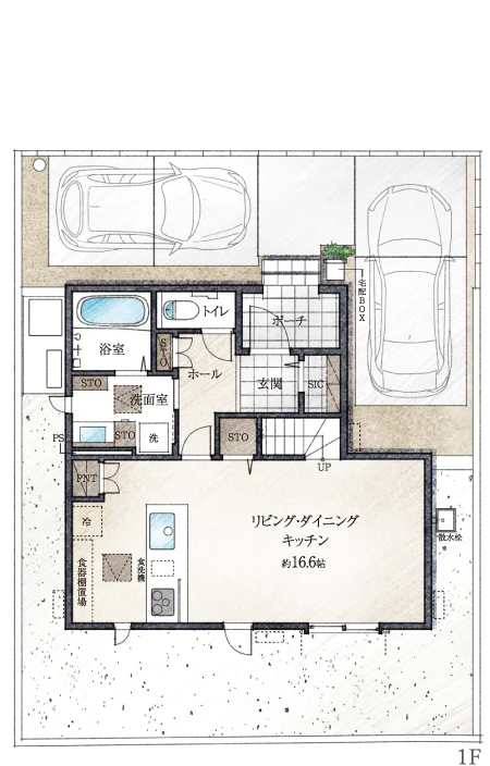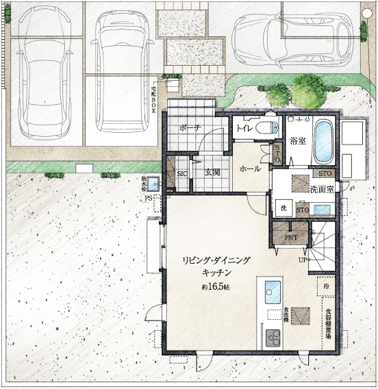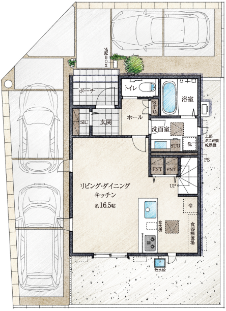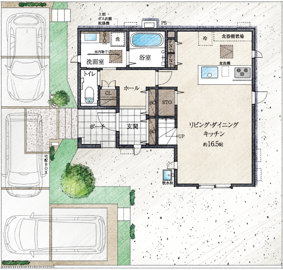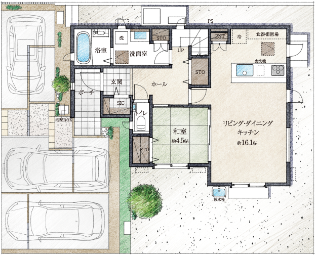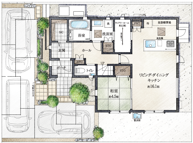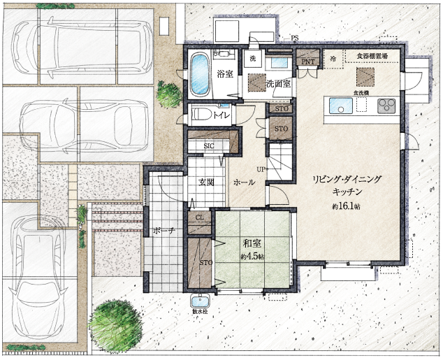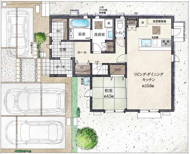 - 上記図面・外構植栽はイメージですので、実際とは多少異なる場合があります。また、車や室内外の家具等は価格には含まれません。
